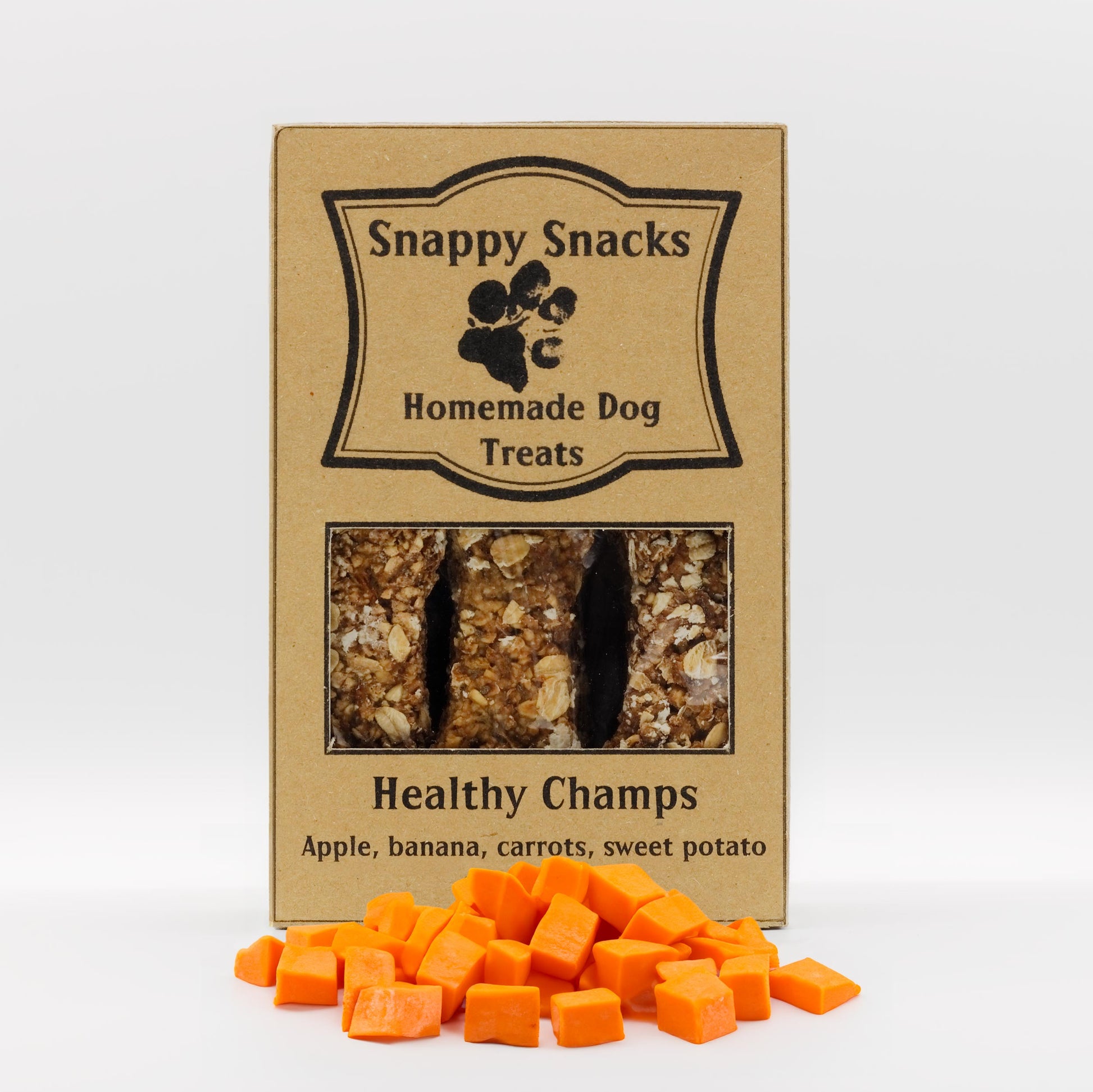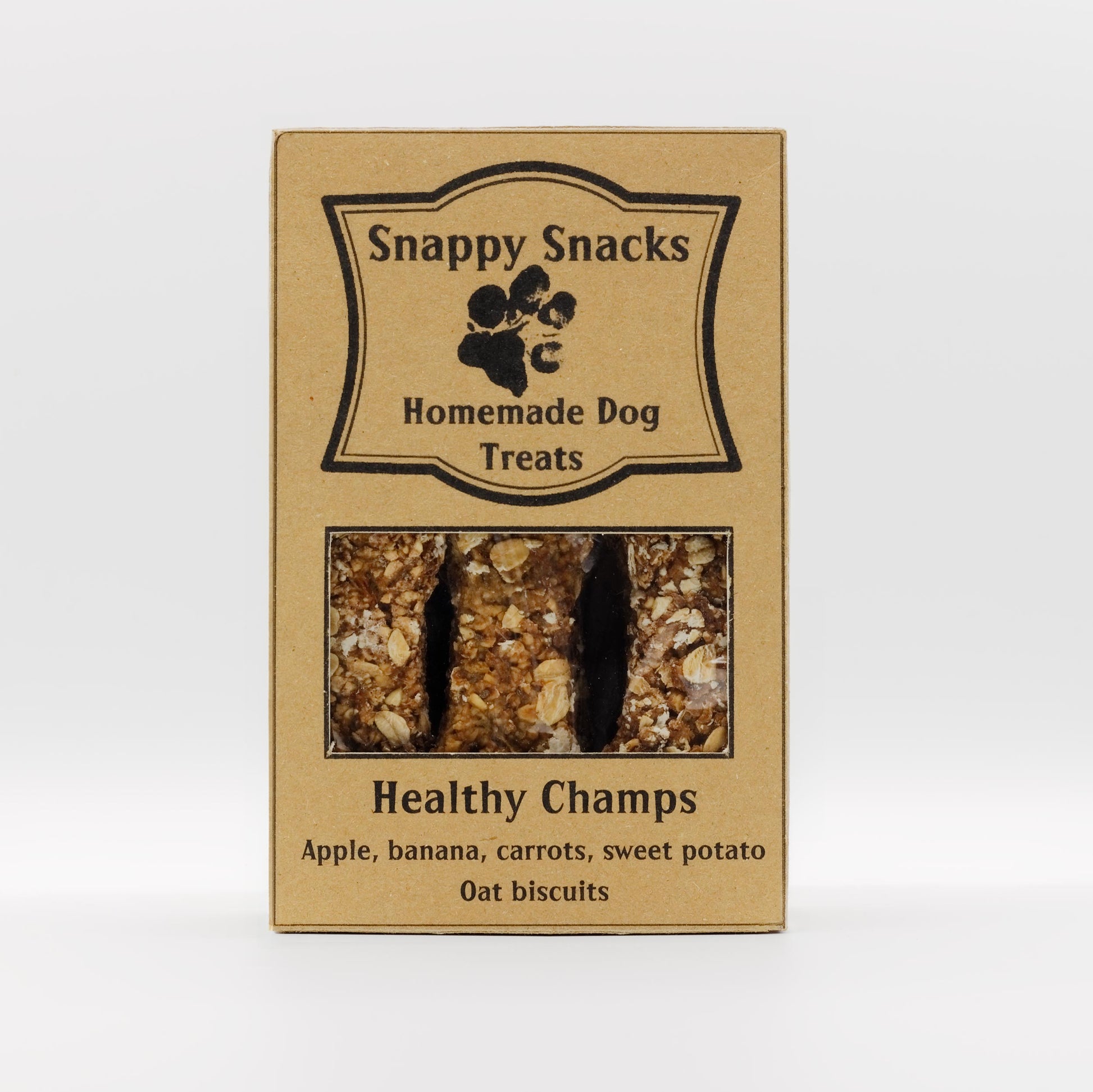 At Snappy Snacks, we’re committed to using natural, carefully selected ingredients with no artificial preservatives or fillers. Our Healthy Champs Dog Treats are made with a blend of rolled oats, fresh carrots, sweet potato, apple, banana, and chia seeds, offering a naturally tasty and satisfying snack your dog will love.