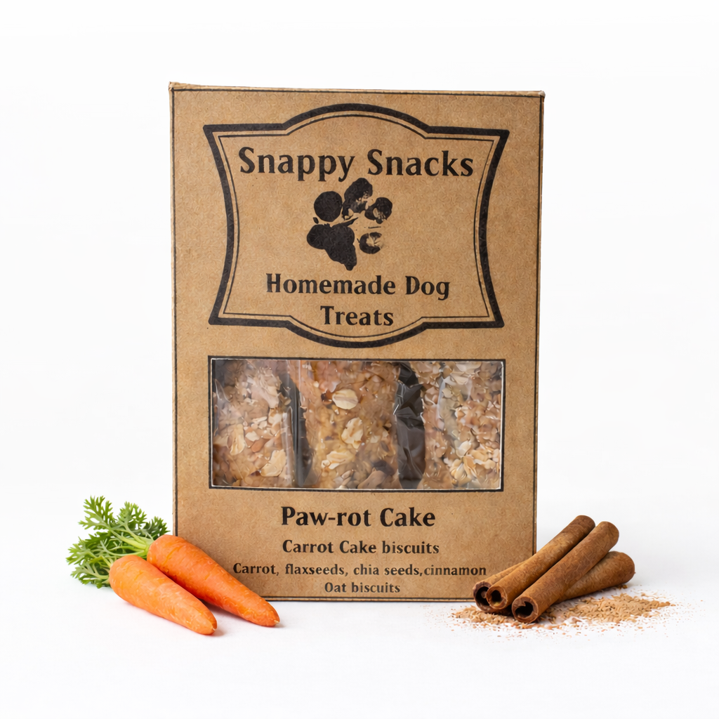 Paw-rot Cake Dog Biscuits are our carrot cakeโinspired treats for dogs โ crunchy, oven-baked biscuits made with carrot, rolled oats, flaxseeds, chia seeds, and a gentle touch of cinnamon for a cosy, cake-like flavour dogs love.